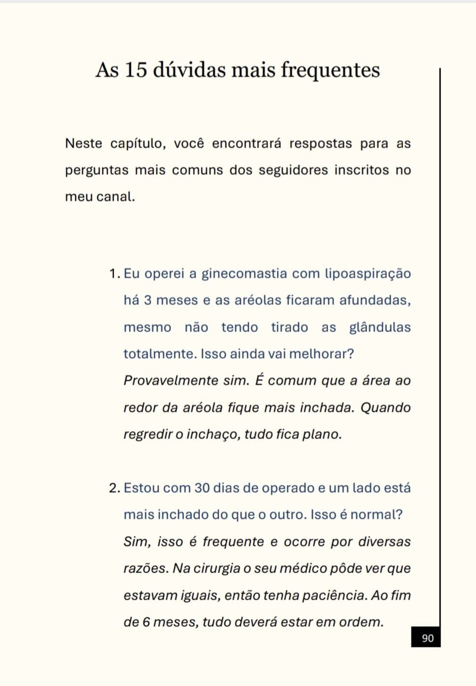 Passei anos incomodado com o volume no peito. Esse guia foi tudo o que eu precisei! Explicou a cirurgia e o que esperar no pós-operatório. Me sinto muito mais seguro pra seguir em frente.